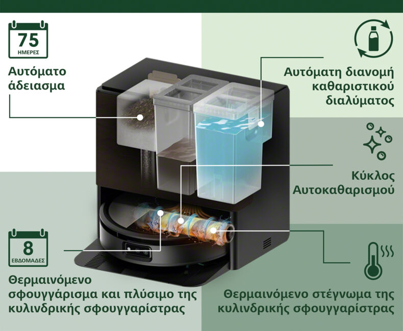 - Αδειάζει αυτόματα τα υπολείμματα σε μια σφραγισμένη σακούλα (υπολείμματα έως 75 ημερών)