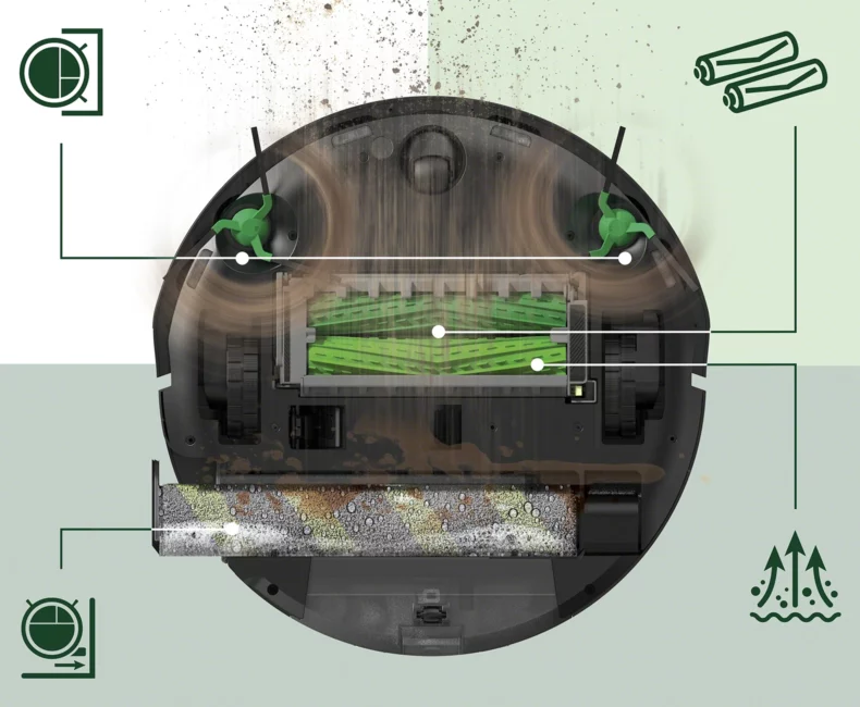 Χρησιμοποιώντας την εφαρμογή Roomba® Home, οι χρήστες μπορούν να επιλέξουν συγκεκριμένους χώρους ή περιοχές επίπλων για καθαρισμό, να προσαρμόσουν τα επίπεδα αναρρόφησης, να επιλέξουν την ένταση του σφουγγαρίσματος, να προγραμματίσουν καθαρισμούς και να δουν έναν πίνακα υγειινής σπιτιού. Το ρομπότ είναι επίσης συμβατό με την Alexa, την Siri και το Google Assistant, επιτρέποντας να αρχίζει ο καθαρισμός με μια απλή φωνητική εντολή.